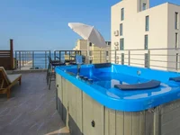 Planning of the apartment: a living room with a dining room, combined with an open kitchen, two bedrooms, 2 bathrooms and a spacious balcony. The apartment is furnished and equipped, sold with all furniture. The apartment is sold with the exclusive right to use the terrace on the roof, which is provided by a panoramic view of the sea.