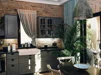 Behind the wide and high doors leading to the bathroom, there is a room for relaxation and enjoyment of life, a cast iron bathtub made by Devon on lion’s feet, located directly against the window, opposite is a shower room made by the same manufacturer, cabinets, armchairs, Venetian mirror over the washbasin, handmade virage lamps assembled according to exclusive designs, various nice interior details in niches above the cabinet, a portal of stone columns and thin curtains made of georgette. All this creates an atmosphere of luxury and comfort, where everyone will feel like a king or queen.