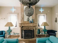 The third bedroom: is a colonially decorated space with a large bed, with a leather headboard and oriental style elements. The room also has a cozy reading alcove and an en-suite bathroom, matching the style of the bedroom with a mosaic shower and luxurious stained glass sconces.
