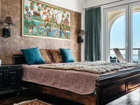 The main entrance to the house is hidden in a closed bay window space under three arches. It continues with a hallway with black wallpaper from Karl Lagerfeld, original mirrors and tall glass wardrobe doors. The hidden LED lighting of the baseboard goes well with spotlights and a black Murano glass chandelier. The spacious living room in the house is seamlessly connected to the kitchen and has all the necessary equipment, including an island with two seats. Three huge panoramic windows complement the feeling of open space and are always filled with light and sun. Yellow sofas, a small wall with “golden” wallpaper from Christian Dior, a corner fireplace lined with black and white marble, and a red Murano chandelier as a whole create a unique harmony and comfort. After two marble steps, the living room continues with a dining room in light gray tones with a terrace and seating area. A special feature of the hall is that the corner sofa with TV easily turns from a relaxation area into a bedroom with its own spacious bathroom and dressing room. A marble “floating” staircase with an original forged railing and lighting on each step leads from the first to the second floor. Natural thick dark oak flooring, paintings and tapestries are well complemented by stunning 18th century antique furniture and an original stone-clad fireplace.