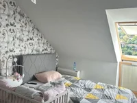 Mieszkanie jest w pełni wyposażone i umeblowane (klimatyzacja/split LG, podgrzewana podłoga w łazience, wbudowane szafy, podwieszane sufity, tynk + biblioteka, ściana TV, oświetlenie, sprzęty AGD Gorenje/LG, meble Natuzzi/Enza Home), elektr. żaluzje, rolety Velux.