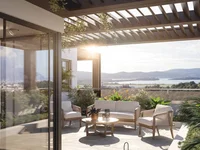 Area 113 m², two bedrooms, living room, two bathrooms, spacious terrace on two sides with sea views.