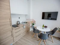 Apartament składa się: duży pokój z kuchnią i ze strefą jadalną, łazienka i taras.
