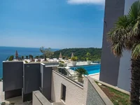Nestled the top the serene hill overlooking the renowned Mogren beach in Budva, we proudly present an exceptional complex of three contemporary villas, now available for purchase. These exquisite properties offer a harmonious blend of architectural innovation, luxurious amenities, and awe-inspiring landscapes.This captivating complex is ingeniously divided into three blocks, artfully arranged to maximize visual appeal and functionality. Villas A and B stand gracefully side by side. At the same time, Villa C integrates into the terrain below, its flat roof terrace seamlessly merging with the expansive space before the upper villas, adorned with an enticing built-in swimming pool. The well-organized north-side entrances are connected by elegant stairs and passages, leading to a shared plateau and a parking area accessed through a convenient ramp.Each villa has four levels and a captivating array of spaces designed to elevate your living experience. The basement of Villas A and B is a haven of relaxation and entertainment, boasting a chic bar with a minibar and a wine shop, a state-of-the-art cinema hall, and a billiards corner. This level also houses three comfortable rooms, two bathrooms, a rejuvenating sauna, and a technical room equipped with a central boiler to ensure a steady hot water supply. The first level connects directly to the pool plateau or through an internal staircase from the ground floor, perfect for mornings of tranquility.The ground floor showcases a spacious, open-concept layout, artfully divided into distinct sections – a lavish living room, a stylish dining area, and a contemporary kitchen. Beyond lies a generously proportioned covered terrace, enveloped by a glass enclosure that grants uninterrupted vistas of the captivating sea. The first floor of each villa comprises two bedrooms, seamlessly linked by a walk-in wardrobe. The master suite boasts a private bathroom and a wardrobe, complemented by a personal terrace. The second bedroom features an en-suite bathroom and a fully glazed seaward-facing wall, inviting the scenic beauty indoors.Villa C’s basement hosts a well-equipped gym, a sauna, a shower area, and a technical room, mirroring the opulence of Villas A and B. The first floor of Villa C offers three sumptuous rooms, each with a private terrace, bathroom, and wardrobe. A connecting corridor leads to a covered terrace featuring a hydromassage tub, with an external staircase ascending to the expansive roof terrace and pool nestled within the basement of Villas A and B.For your convenience, a service apartment is thoughtfully positioned on the basement level of Villas A and B. This apartment exudes sophistication and coziness, housing a bedroom, a wardrobe, a living room, a dining area, a fully-equipped kitchen, and a bathroom.This trio of villas is offered fully furnished, meticulously adorned in a contemporary style enriched with warm, inviting elements reminiscent of a cherished family home. Each villa features an electric fireplace and central ceiling cassette air conditioners for ultimate comfort. Modern amenities extend to telephone, internet, intercom, and video surveillance connections, accessible via Wi-Fi for seamless control.If your dreams encompass a coastal haven that harmoniously marries spectacular sea and mountain vistas with refined luxury, this extraordinary complex beckons as an exceptional choice. Evoke a lifestyle of indulgence and tranquility by owning a piece of this Montenegrin masterpiece. Contact us today to embark on a journey toward unparalleled elegance and serenity. Your vision of coastal living awaits within the embrace of these splendid villas.