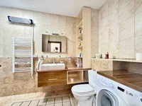 Spacious, bright apartment with 2 bedrooms, living room with kitchen and dining area, 2 bathrooms. The apartment is dry and comfortable for year-round living. Spacious terrace with direct sea view. The apartment has a comfortable layout and is finished with high-quality environmentally friendly materials. Air conditioning in every room. The kitchen is fully equipped. It has its own garage space. On the territory of the house there is a green area and a barbecue area; a private garage. The sea is 900m away. There is a management company in the house. Clean documents.