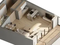 Raspored je promišljeno osmišljen za ugodan život: prostrani ulazni hodnik, praktična kupaonica i svijetao dnevni boravak s pristopom terasi s pogledom na planine, stvarajući osjećaj ugode i privatnosti.