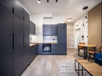 The apartment consists of a large room with a kitchenette and a bathroom with a shower. All furniture visible in the photos is also for sale.