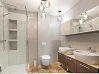 W salonie nowe meble: sofa, stół, szafka RTV. W łazience znajdują się dwie umywalki, duży prysznic, pralka i mnóstwo szafek.
