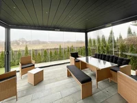 Niewątpliwym atutem jest pergola tarasowa TOSCANA firmy Surma w wersji maksymalnej z funkcją regulacji kąta lameli, przeszklona z trzech stron roletami wiszącymi, podgrzewana i podświetlana, sterowana za pomocą pilota.