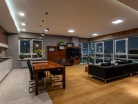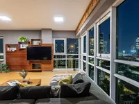 Przestronny salon z dużymi oknami, które zapewniają wspaniały widok na miasto.