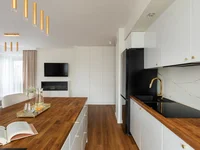 Wnętrze apartamentu wykończone jest wysokiej jakości materiałami. Podłogi to wysokiej jakości deski podłogowe i kafelki, a drzwi wewnętrzne są solidne.Do mieszkania przynależy balkon z widokiem na tereny zielone. Dodatkowo: