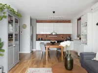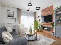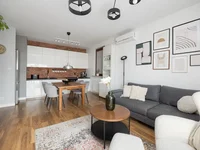 Mieszkanie jest w doskonałym stanie, wykończone i wyposażone na wysokim poziomie. W salonie znajduje się dekoracyjna ściana z cegły, biokominek i klimatyzacja LG, serwisowana od 2022 roku. Kuchnia wyposażona jest w sprzęt AGD marki Bosch (kuchenka, piekarnik, lodówka, zmywarka, mikrofalówka). Łazienka wyłożona jest płytkami imitującymi beton, wyposażona jest w wannę, prysznic, system dwóch umywalek i pralnię. Sypialnia i garderoba zapewniają miejsce do przechowywania rzeczy, a istnieje możliwość ich przekształcenia w dodatkową łazienkę. Apartament ma dwie orientacje (południe i zachód) i jest położony w spokojnej części kompleksu.
