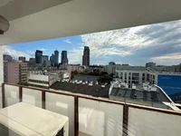 Panoramiczny widok na wieżowce Warszawy – okna i balkony wychodzą na centrum miasta.
