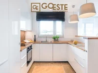 Widna kuchnia w pełni wyposażona w nowoczesną zabudowę i sprzęt AGD (lodówka z zamrażarką, zmywarka, płyta indukcyjna, piekarnik, okap).