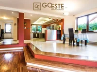 Salon z jadalnią (39,68 m2) - imponująca przestrzeń dzienna z kominkiem z rozprowadzeniem ciepła, zapewniającym przyjemną atmosferę. Dzięki dużym oknom wychodzącym na północny zachód salon jest doskonale doświetlony, a wyjście na taras umożliwia szybki dostęp do ogrodu.