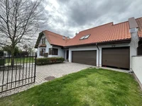 Na parterze znajduje się salon, kuchnia, dwie sypialnie, garderoba, łazienka i garaż na dwa samochody.