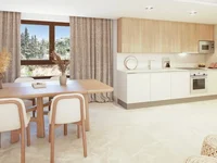 Wnętrze jest zaprojektowane z naciskiem na efektywne wykorzystanie przestrzeni i nowoczesny design. Otwarty salon z dużymi oknami płynnie przechodzi na taras i łączy wewnętrzne i zewnętrzne obszary życia. Dwie łazienki zapewniają ponad standardowy komfort, czy korzystać z mieszkania dla siebie lub dla gości. Ogólne wrażenie podkreślają wysokiej jakości materiały i czyste linie architektoniczne.