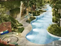 Zewnętrzna powierzchnia budynku uzupełnia otoczenie tropikalne, z zielonymi przestrzeniami, cechami wodnymi i tarasami na dachu przeznaczonymi do relaksu.
