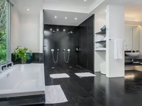 Master Suite: Features a private sea-view balcony, cozy living/TV area, spacious sleeping quarters, and an expansive en-suite bathroom with a bathtub, double sinks, and dual showers.