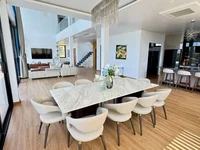 The central floor features a double-height ceiling in the spacious open-plan living and dining area, accompanied by a fully equipped Western kitchen, separate Thai kitchen, games room, and home study. Floor-to-ceiling glass doors open onto a generous pool terrace with a 19-meter private infinity swimming pool, lounge space, and shaded seating—all perfect for entertaining or relaxing.