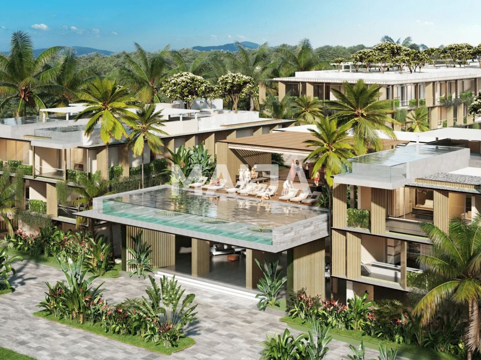 ✔ The development sits directly on the first sea line, just 50 meters from Bang Tao Beach along Phuket's west coast. The location offers proximity to Blue Tree Phuket, Boat Avenue, Porto de Phuket, and an international school. Seventy percent of the territory is dedicated to parks, gardens, pools, and lakes.