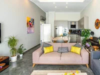 Living Room & Open KitchenThe black-white contrast in the kitchen cabinets combines with a marble backsplash to emphasize contemporary lines. The open-plan design ensures a spacious atmosphere, perfect for both gatherings and daily life. Hidden LED lighting in the ceiling offers extra potential for mood and accent lighting.
