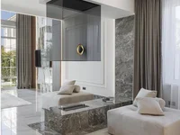 Na dziedzińcu znajduje się podgrzewany basen. Projekt krajobrazu terenu z wieloletnimi drzewami i luksusowymi kwietnikami.