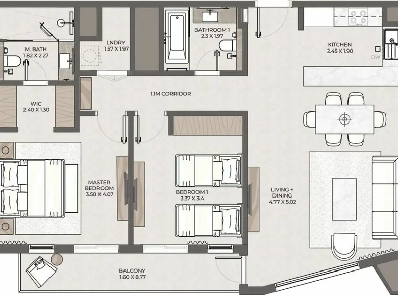 Terrazzo Residences oferuje apartamenty z 1 do 3 sypialniami, o powierzchni od 71 do 197 metrów kwadratowych. Każdy szczegół wnętrza został zaprojektowany tak, aby zapewnić harmonię i spokój, a ciepłe odcienie zieleni, brązu i błękitu tworzą spokojną przystań w sercu tętniącego życiem Dubaju. Każda jednostka posiada co najmniej jeden balkon lub taras z panoramicznym widokiem.