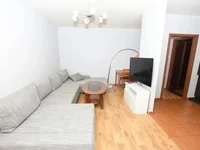 As you step into the apartment, you’ll be greeted by an abundance of natural light. The spacious living room spanning 19.8 m2 serves as the heart of the home and leads to a delightful balcony, perfect for enjoying your morning coffee or basking in the sun. The living room is thoughtfully furnished with a comfortable sofa, a TV with a bookcase, a coffee table, a dining table with chairs, and a lamp, providing a cozy and welcoming atmosphere.