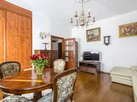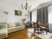 You can make a second room in place of the kitchen and move the kitchen to a large room. The apartment is located on a high ground floor, and all windows overlook a quiet, tree-lined courtyard. The apartment has a large basement. Central heating, plastic windows, wooden floor. The apartment needs to be refreshed or renovated.