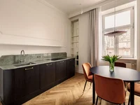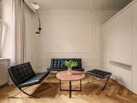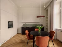 The apartment is finished using the highest materials with attention to every aesthetic detail. This historic part of the townhouse was the only one untouched by the war. The original interior layout has been preserved, and the noble materials used for finishing create a timeless, luxurious interior. The whole is complemented by beautiful plaster stucco. Herringbone oak parquet floors and marble floors in the bathroom.