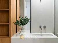 This 80.34 m² ground-floor apartment features a well-thought-out layout, consisting of: • living room with an open kitchen: 30.15 m² • 2 bedrooms: 17.6 m² and 11.77 m² • 2 bathrooms: 5.2 m² and 4.83 m² • hallway: 10.79 m²