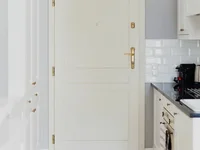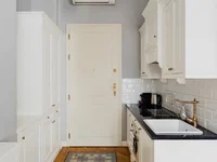 Built in 1890 and renovated in 2014, the building retains historical details and elegant style combined with modern solutions. Tall windows with shutters and a ceiling height of 3.5 meters create a feeling of space and light. The kitchen is fully equipped: custom-made furniture, Smeg stove, Amica hob, Cmielów porcelain, washing machine and coffee maker. The oak floor, laid in French herringbone, harmonizes with the cement tiles from a Parisian apartment building.