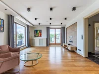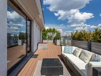 The penthouse has two terraces: one with a south-west view from the living room, the other by the master bedroom with an east view. There is also a cozy loggia in one of the bedrooms. The apartment has four sides and includes an entrance hall with built-in wardrobes, a living room, a dining room, a separate kitchen, a pantry, a guest toilet, a laundry room, three bedrooms, a bathroom and a master bedroom with a large built-in wardrobe, an en-suite bathroom and a dressing room. The apartment has air conditioning in each room and high-quality finishing. Additionally, a heated room on the terrace (storage room) is provided. The price includes two spaces in the underground garage.]]>