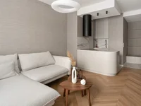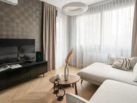 The apartment is fully furnished and equipped with household appliances: a washing machine, a refrigerator, a dishwasher, a microwave and an induction hob. There is audiovisual equipment with a 50-inch TV. The floor is made of oak parquet in the French style, and the furniture is custom-made. The kitchen and cabinets have stone countertops, matching the modernist style of the building. The apartment has a smart home system, air conditioning in each room, electric mosquito nets and heated floors in the bathroom.