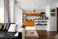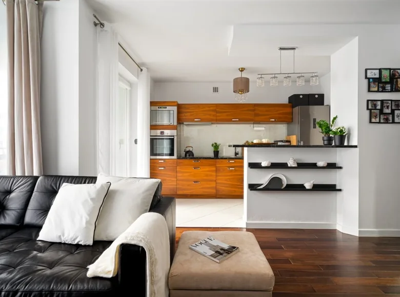 A spacious 3-room apartment of 61.92 m² in a quiet area near Warsaw is for sale. The apartment is located on the second floor of a 4-storey building built in 2009. The layout includes a living room with a kitchen annex (south side), two bedrooms (north side), a bathroom, a hallway and a spacious loggia. The apartment is finished to a good standard: exotic wood on the floor in the rooms, granite countertops in the kitchen, built-in appliances (induction hob, dishwasher, refrigerator, oven, microwave). The bathroom has a large bathtub, and in the hallway there is a built-in wardrobe.