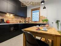 The kitchen has been fully equipped with modern appliances of renowned brands (Samsung, Bosch) and combined with an elegant, large table, which is perfect for both daily meals and meetings with family or friends. The character of the kitchen is added by the stylish brick motif, emphasizing the industrial accent of the interior.