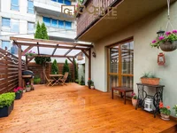 The terrace is surrounded by a discreet fence, which provides privacy, and a beautiful garden full of shrubs and flowers creates a pleasant environment for rest in the open air. On the property is also a garden cottage for tools, which facilitates the organisation of garden care equipment.
