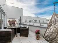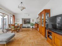 The apartment has two bedrooms, two bathrooms (one with a bathtub, the other with a shower), a bright separate kitchen with a built-in pantry, a living room with an exit to a large terrace with a view of the sunset. The ceilings are over 3 meters high, there is an air conditioning system. The interiors are finished to a high standard, with oak parquet and large windows on three sides of the world. The apartment also has a spacious hall with roomy wardrobes.