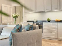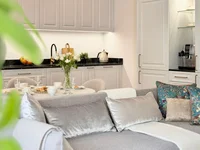 The layout includes a spacious living room with a kitchen, two bedrooms (one with a dressing room), a modern bathroom and a hall. The apartment is bright and quiet thanks to the double-sided arrangement of the windows and the view of the green courtyard. The house was designed by the famous architect Zdzisław Mączeński, the façade is in the neoclassical style with elements of art deco. The original staircases, pre-war elements and historical atmosphere have been preserved.