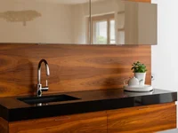 • Elegant bathroom with a bathtub, travertine finish, Villeroy & Boch fittings