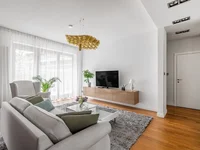 The interior is bright, sunny, and tastefully decorated. Wooden floors, natural light, and well-chosen colors create a harmonious and comfortable atmosphere. High-quality materials and appliances were used throughout. The layout is functional and gives a sense of space and order.