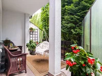 The ground floor includes a bright living room with a fireplace, a dining area next to an open kitchen, and access to two terraces – one inner, one leading to the garden. There is also a guest WC.