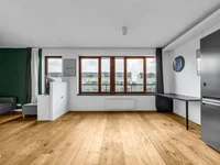 Living room with kitchenette (29.25 m²) - Large, spacious with windows along the entire length of the wall. The kitchenette is equipped with furniture and appliances such as a refrigerator, dishwasher, and induction hob. It is possible to easily separate a bedroom/study with an area of 8.35 m². Barlinecka floorboards.