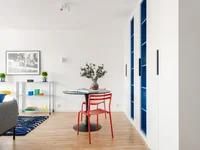 The built-in kitchen stands out with a contrasting accent - white base paired with intense, blue upper cabinets creating a striking detail. The kitchen is fully equipped with appliances: dishwasher, oven, induction hob, extractor hood.