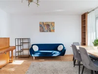 The apartment has undergone a general renovation and impresses with its modern, cozy interior. The two-sided layout (eastern and western exposure) ensures excellent lighting and a functional division of space. It consists of a living room with access to a balcony, two independent bedrooms, a kitchen equipped with custom-made furniture and built-in appliances, a bathroom with a shower, a separate toilet, and a hallway. The windows offer a beautiful view of the greenery. The apartment includes a cellar.
