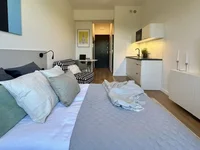 Bright, Functional Living SpaceThe main room combines a cozy living area with a thoughtfully designed open-plan kitchenette. Large windows and high ceilings allow plenty of natural light to fill the space throughout the day, creating a warm and welcoming atmosphere.