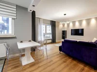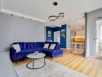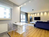 Modern apartment in a very good location near Kondratowicz Metro station, TARGEK shopping centre and Brodnowski Forest. The apartment is located on the first floor in the closed protected Moderna estate. The 72 sqm apartment consists of a:* living room connected to a dining room and a half-open kitchen equipped with household appliances and an exit to the balcony*a bedroom with a large double bed*a study room(a nursery for children or a second bedroom)*bathrooms with a large shower *a laundry room*a wardrobe*