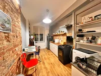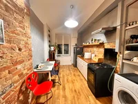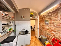The apartment consists of two spacious rooms, each approximately 22 m², a separate, large kitchen with a window — which could easily be adapted into an additional room — as well as a hallway and a bathroom. High ceilings (2.9 m) give the interior a unique sense of space. One of the rooms features a characteristic large Venetian-style window, and both the hallway and the areas around the windows include elegant arched vaults, emphasizing the unique character of the apartment.
