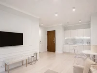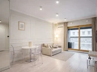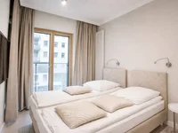 Modern, fully furnished apartment located on the 6th floor of the prestigious Mennica Residence. This property features a spacious living room with a kitchen connected to the living room, and a balcony offering stunning city views, providing additional space for relaxation.